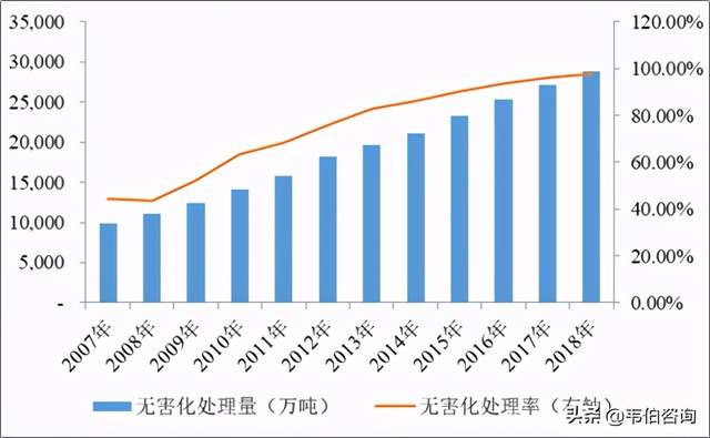 注:统计范围包括城市和县城;无害化处理率=无害化处理量⁄垃圾清运量;数据来源于《城乡建设统计年鉴》