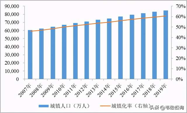 图表1:2007年至2019年各年末我国城镇人口及城镇化率变化情况