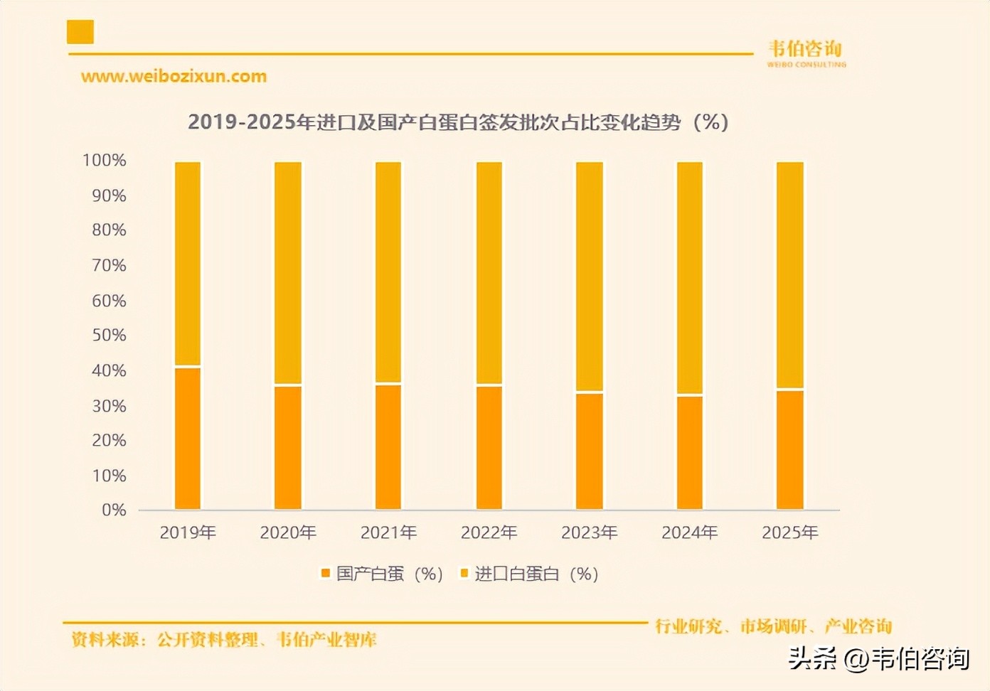 其中:国产品种批次占比约35%;进口品种批次占比65%。国产白蛋白批签发增长速度(7.2%)高于进口产品(0.8%),占比较2024年有所提升。