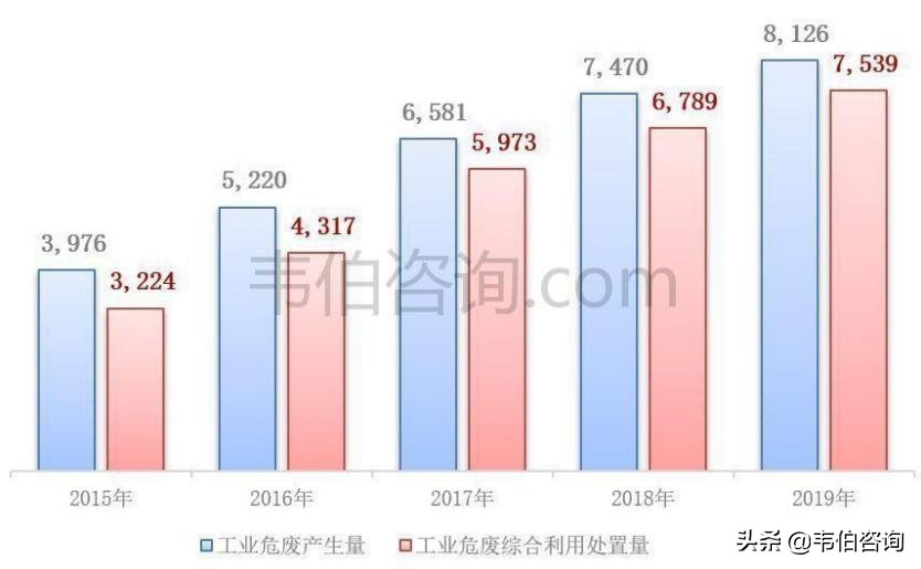 2017-2019年,全国工业危废产生量分别为6581、7370、8126万吨,同比分别增长26.1%、13.5%、8.8%,近三年增幅有所放缓。