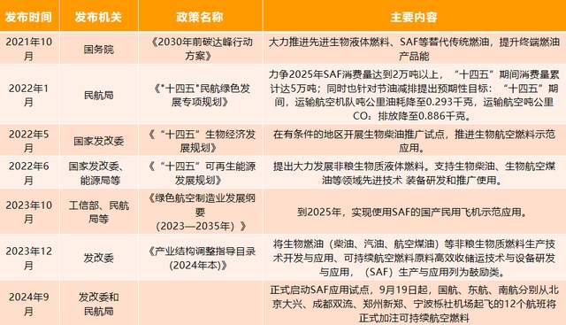 2023年10月,工业和信息化部、科技部、财政部、民航局联合印发《绿色航空制造业发展纲要(2023—2035年)》提出:到2025年,实现使用SAF的国产民用飞机示范应用。