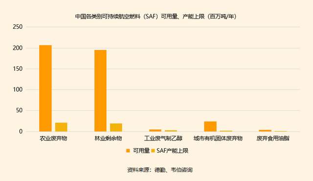 若这些原料得到充分的利用,理论上可持续航空燃料(SAF)的产能上限超过4600万吨/年,发展潜力巨大。