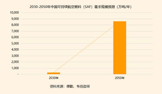 国际航空运输协会预测:2025年和2030年全球可持续航空燃料(SAF)需求量将分别达到600万吨和2000万吨;到2050年,SAF将承担航空业65%以上的减排贡献,需求量高达35,800万吨。